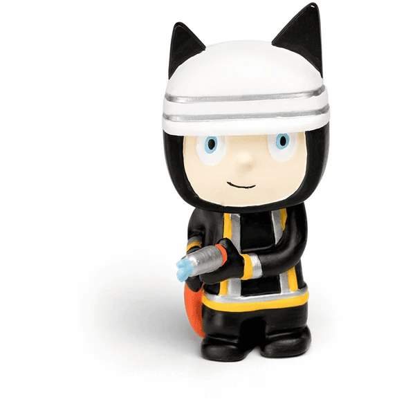 Der Kreativ-Tonie Feuerwehrmann kommt in schwarzem Feuerwehranzug und hält den Schlauch fest in beiden Händen. Er ist bereit zum Löschen!